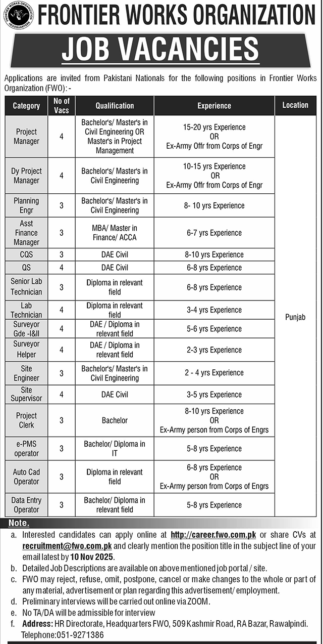 a. Interested candidates can apply online at http://e.career.fwo.com.pk or share CVs at recruitment@fwo.com.pk and clearly mention the position title in the subject line of your email latest by 10 Nov 2025.