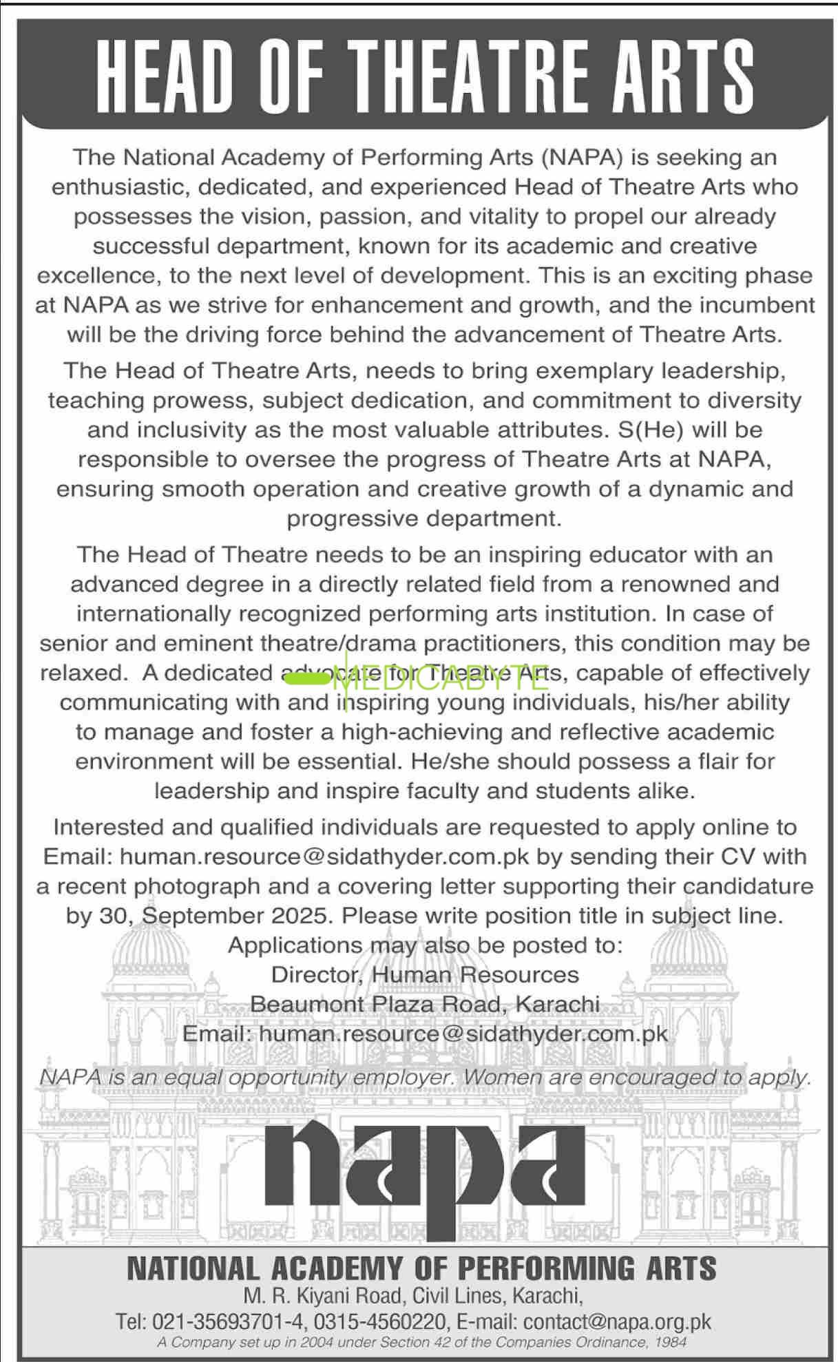 Head of Theatre Arts Jobs at National Academy of Performing Arts (NAPA)