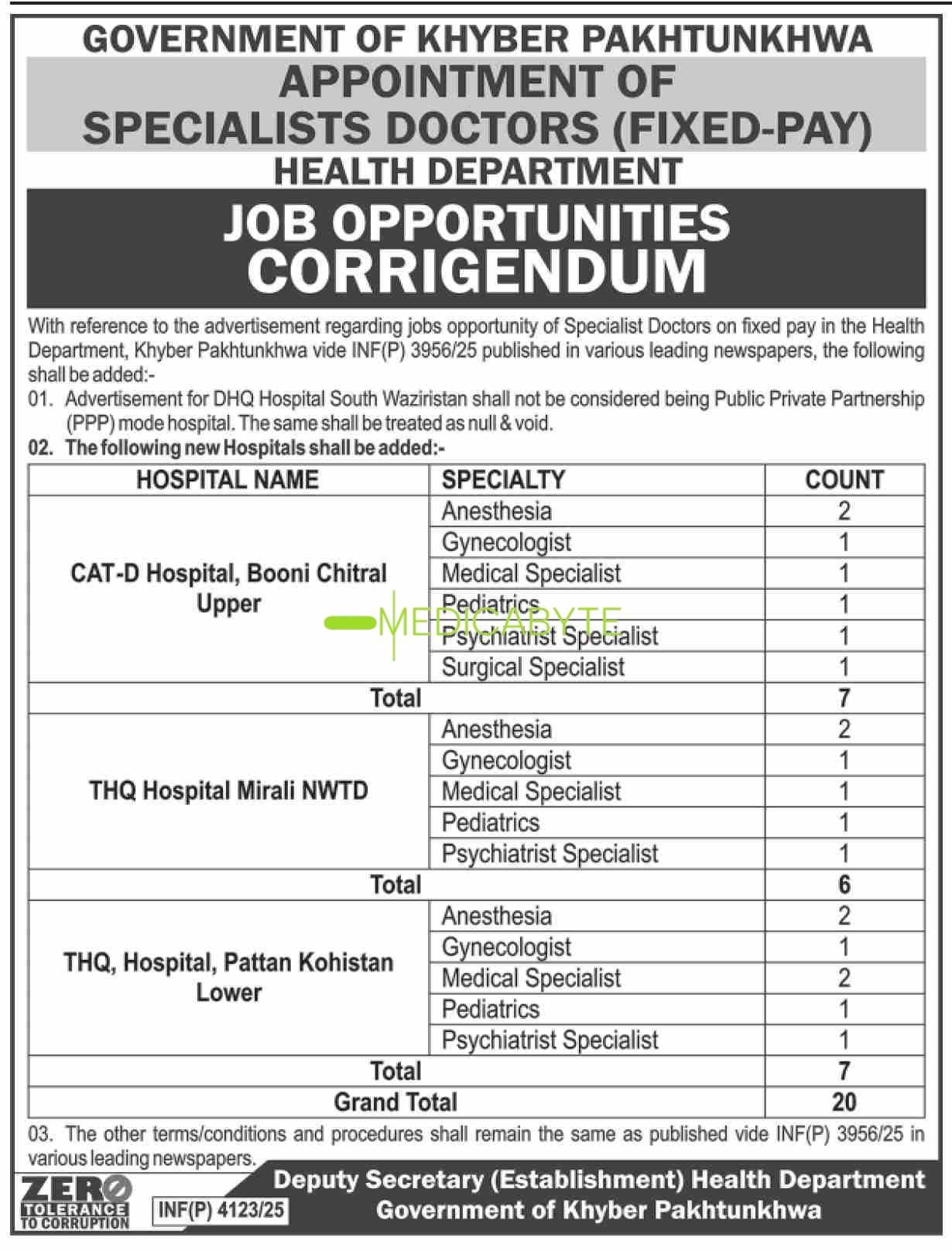 Health Department Job Opportunities Corrigendum for Appointment of Specialists Doctors (Fixed-Pay)