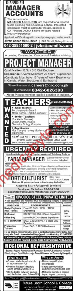 Manager Accounts, Project Manager, Teachers, Farm Manager and Regional Representation Posted on March 8, 2026 Job Type: Private Jobs Job Category: Jang Newspaper Jobs Job Location: Lahore Jobs Manager Accounts, Project Manager, Teachers, Farm Manager and Regional Representation Manager Accounts, Project Manager, Teachers, Farm Manager and Regional Representation Apply for this position Full Name *Email *Phone *Cover Letter *Upload CV/Resume *Allowed Type(s): .pdf, .doc, .docxBy using this form you agree with the storage and handling of your data by this website. *