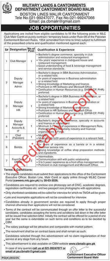 Military Lands & Contonments Departments New Jobs 2026 Posted on March 7, 2026 Job Type: Project Jobs Job Category: Federal Government Jobs Job Location: Islamabad Jobs Military Lands & Contonments Departments New Jobs 2026 Military Lands & Contonments Departments New Jobs 2026 Apply for this position Full Name *Email *Phone *Cover Letter *Upload CV/Resume *Allowed Type(s): .pdf, .doc, .docxBy using this form you agree with the storage and handling of your data by this website. *
