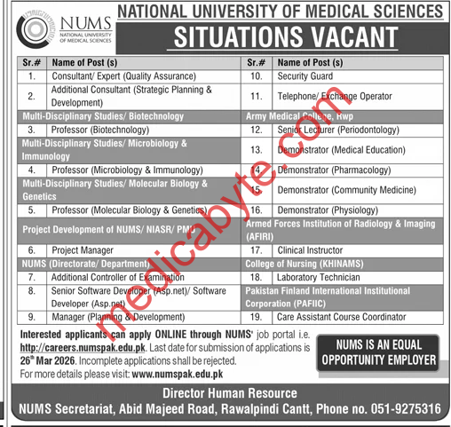 National University of Medical Sciences NUMS New Jobs 2026 Posted on March 9, 2026 Job Type: Contract Jobs Job Category: Jang Newspaper Jobs Job Location: Rawalpindi Jobs National University of Medical Sciences NUMS New Jobs 2026 National University of Medical Sciences NUMS New Jobs 2026 Apply for this position Full Name *Email *Phone *Cover Letter *Upload CV/Resume *Allowed Type(s): .pdf, .doc, .docxBy using this form you agree with the storage and handling of your data by this website. *