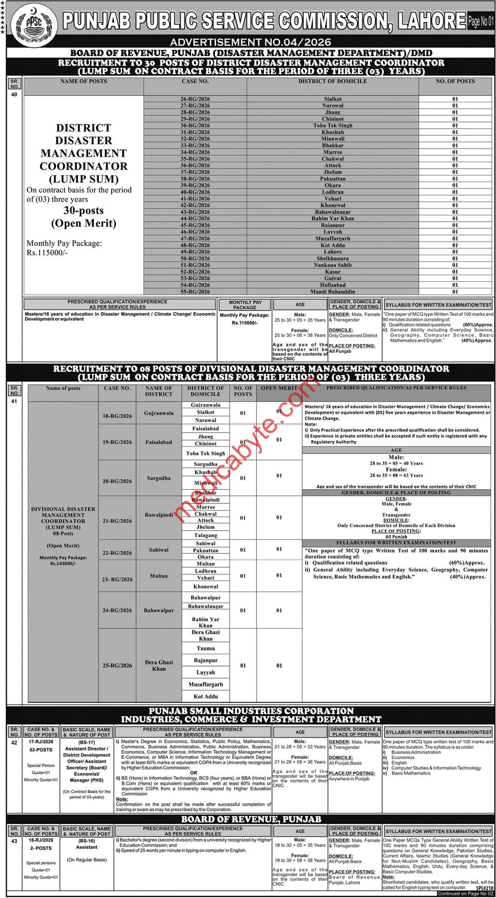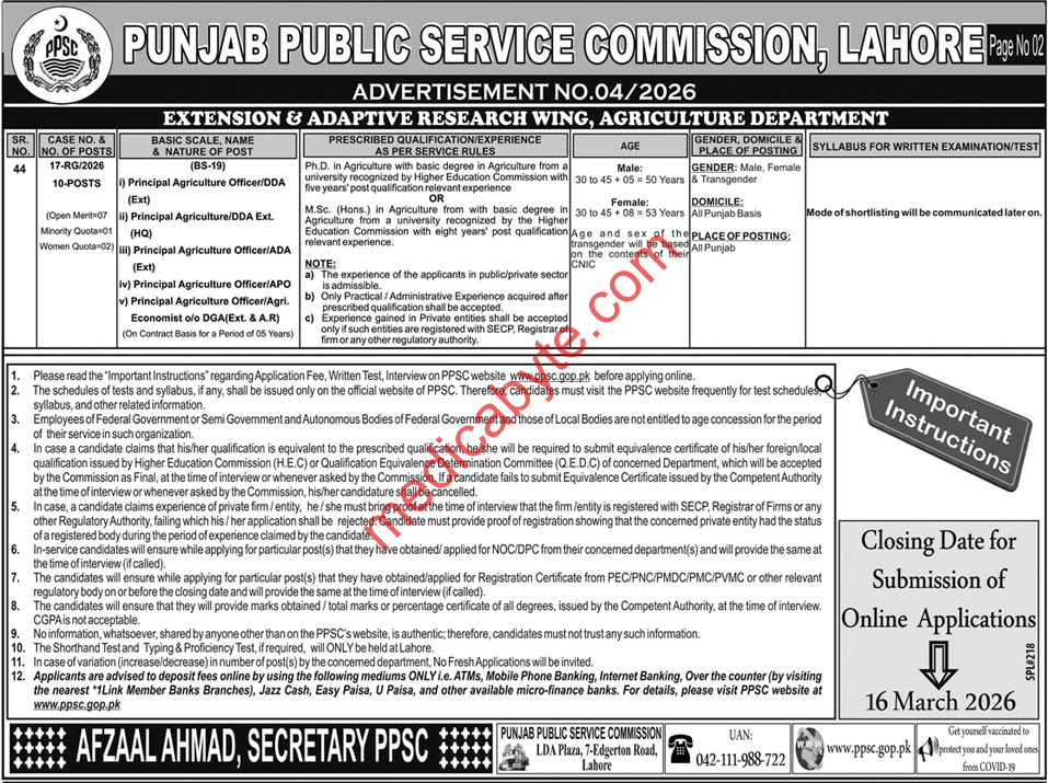 The Punjab Public Service Commission (PPSC) has released Advertisement No. 04/2026, featuring various contract and regular positions across multiple departments.