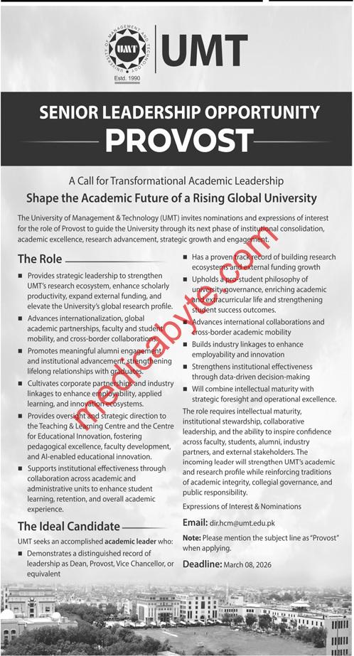 The University of Management and Technology (UMT) has announced a senior leadership opening for the position of Provost. This role is designed for a transformational leader intended to guide the university through strategic growth and academic excellence.
