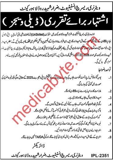 The Veterinary Research Institute (VRI) on Zarar Shaheed Road, Lahore Cantt, has announced job openings for Unskilled Attendants on a daily-wage basis.
