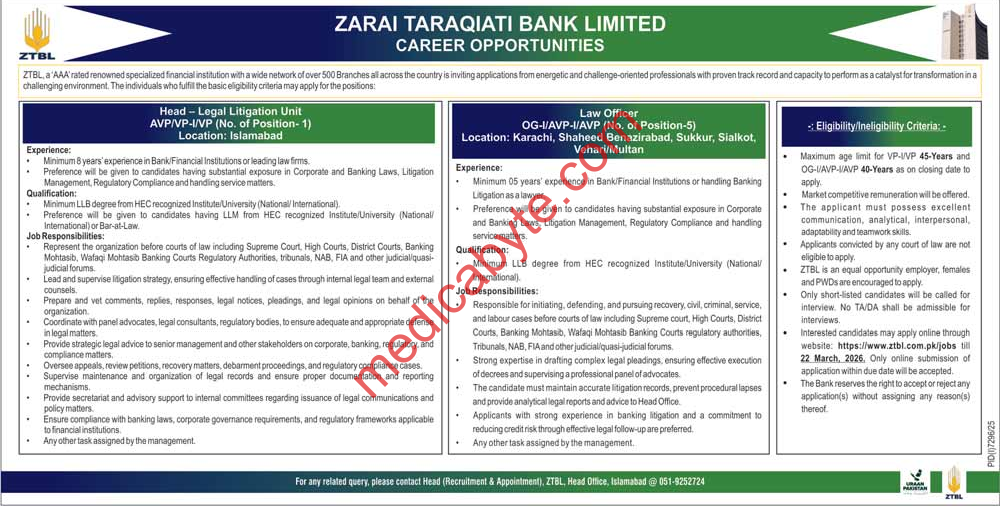 Zarai Taraqiyati Bank Limited ZTBL New Jobs 2026 Posted on March 9, 2026 Job Type: Regular Jobs Job Category: Jang Newspaper Jobs Job Location: Islamabad Jobs Zarai Taraqiyati Bank Limited ZTBL New Jobs 2026 Zarai Taraqiyati Bank Limited ZTBL New Jobs 2026 Apply for this position Full Name *Email *Phone *Cover Letter *Upload CV/Resume *Allowed Type(s): .pdf, .doc, .docxBy using this form you agree with the storage and handling of your data by this website. *