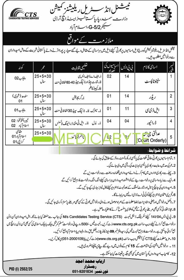 Applications are invited from Pakistani citizens who meet the specified criteria for recruitment to the following posts in the Courts Wing of the National Industrial Relations Commission.