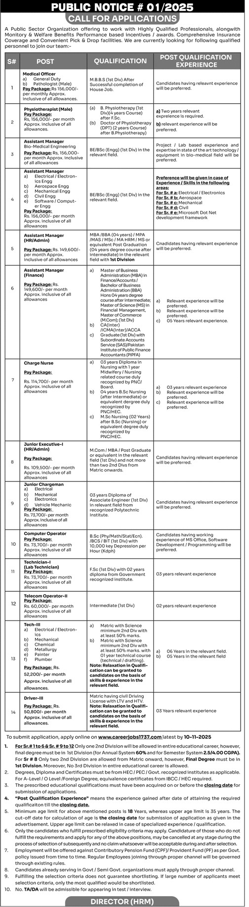 | 11 | Driver (HTV) (Pay Package 35,000/- to 45,000/- per month approx. inclusive of all allowances) | Matriculation with Valid HTV Driving License from Government of Pakistan (1st Div). | 03 years relevant experience. |