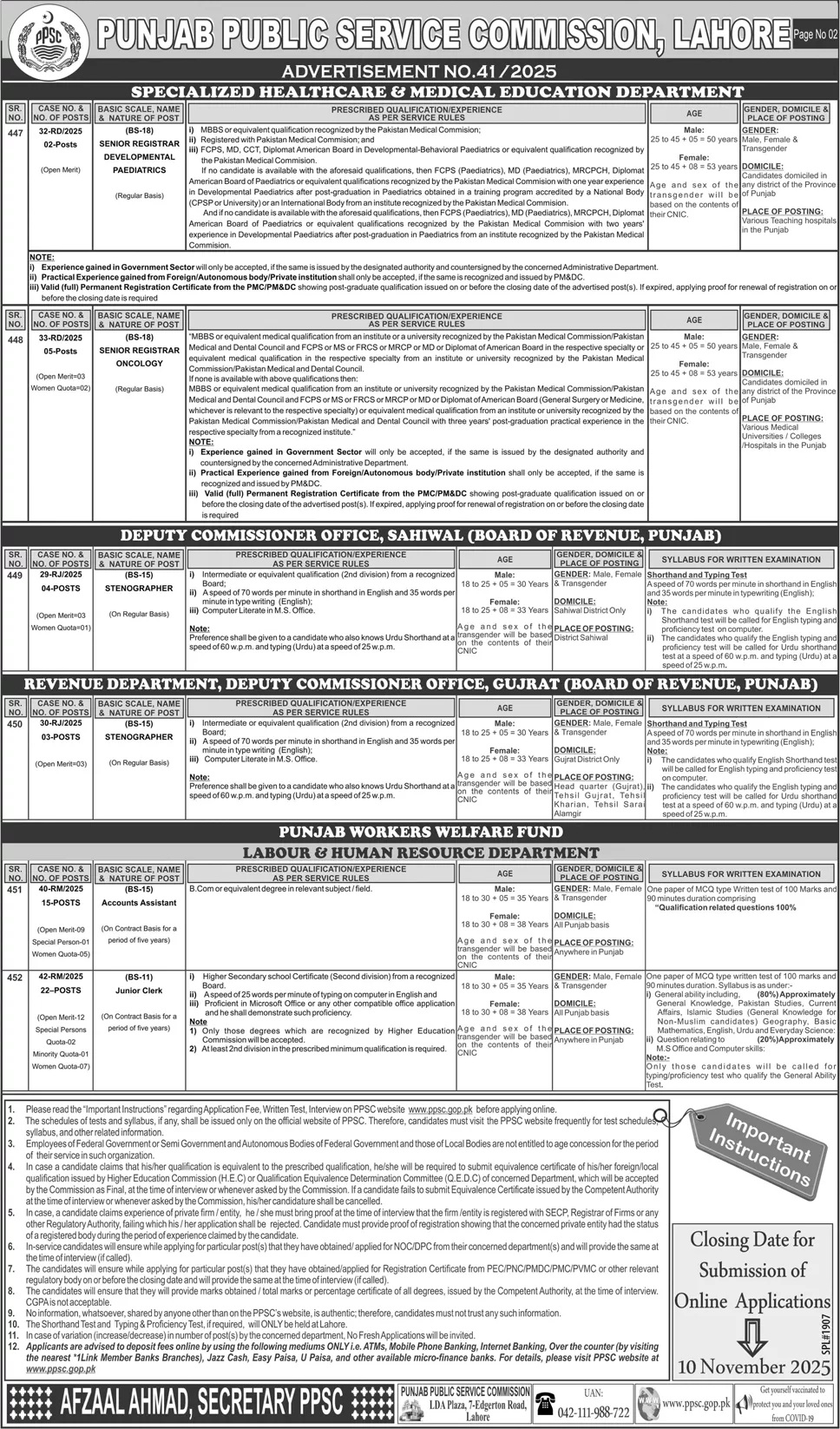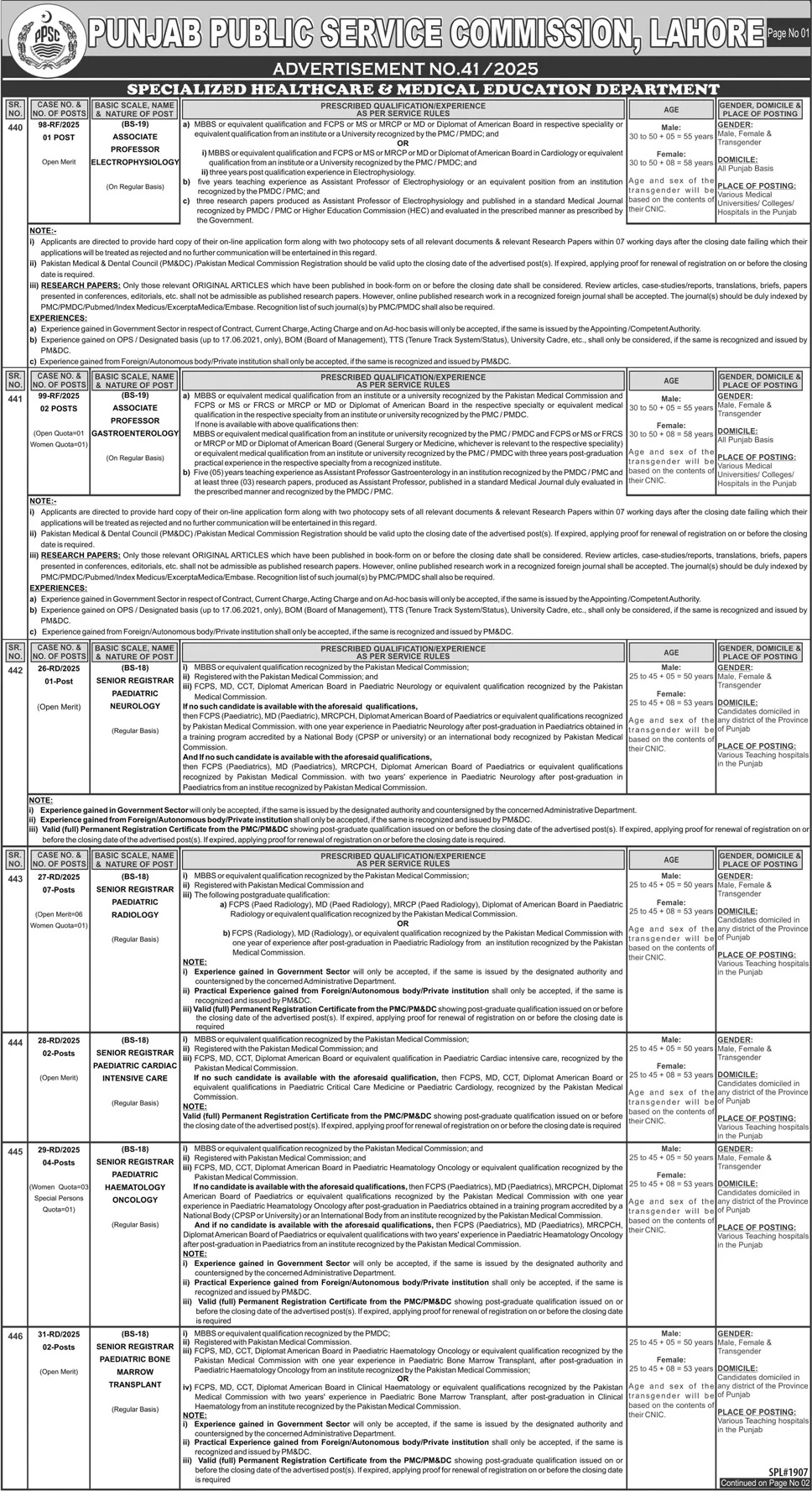 | 448 | 33-RD/2025 (02 Posts) | SENIOR REGISTRAR (REGULAR BASIS) | (I) M.B.B.S or equivalent qualification from an institution or a university recognized by the Pakistan Medical Commission/Pakistan Medical & Dental Council. (II) PM&DC Level-III qualification i.e. M.D./M.S./FCPS or equivalent qualification in relevant specialty from an institution or university recognized by the Pakistan Medical Commission/Pakistan Medical & Dental Council. AND (III) Experience: – (a) Four years experience as Post Graduate Trainee/Resident in the relevant specialty in a recognized teaching institution/Hospital. | 25 to 45 + 05 = 50 years (Male) 25 to 45 + 08 = 53 years (Female) 25 to 45 + 08 = 53 years (Special Person) | GENDER: Male, Female & Transgender. DOMICILE: All Punjab. PLACE OF POSTING: Various Medical Institutions throughout Punjab, Pakistan. |